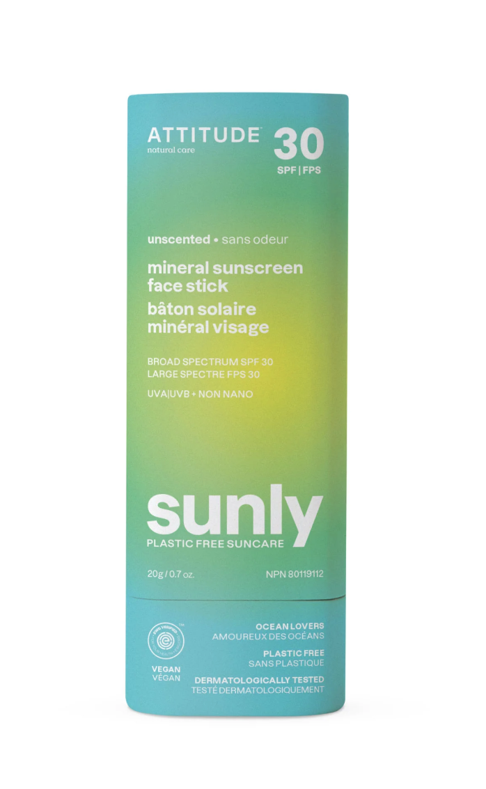 Sunly protège votre peau. Pour limiter notre impact sur les océans, cette protection solaire visage en bâton ATTITUDE™ FPS 30 est formulée avec de l’oxyde de zinc non nano. Ce filtre minéral assure une défense à large spectre contre les rayons UVA et UVB. Pratique et écologique, ce tube en carton biodégradable garantit une application en toute simplicité, sans laisser de traces blanches! Une formule EWG VERIFIED™, végane et testée dermatologiquement pour profiter des activités en plein air en toute confiance!